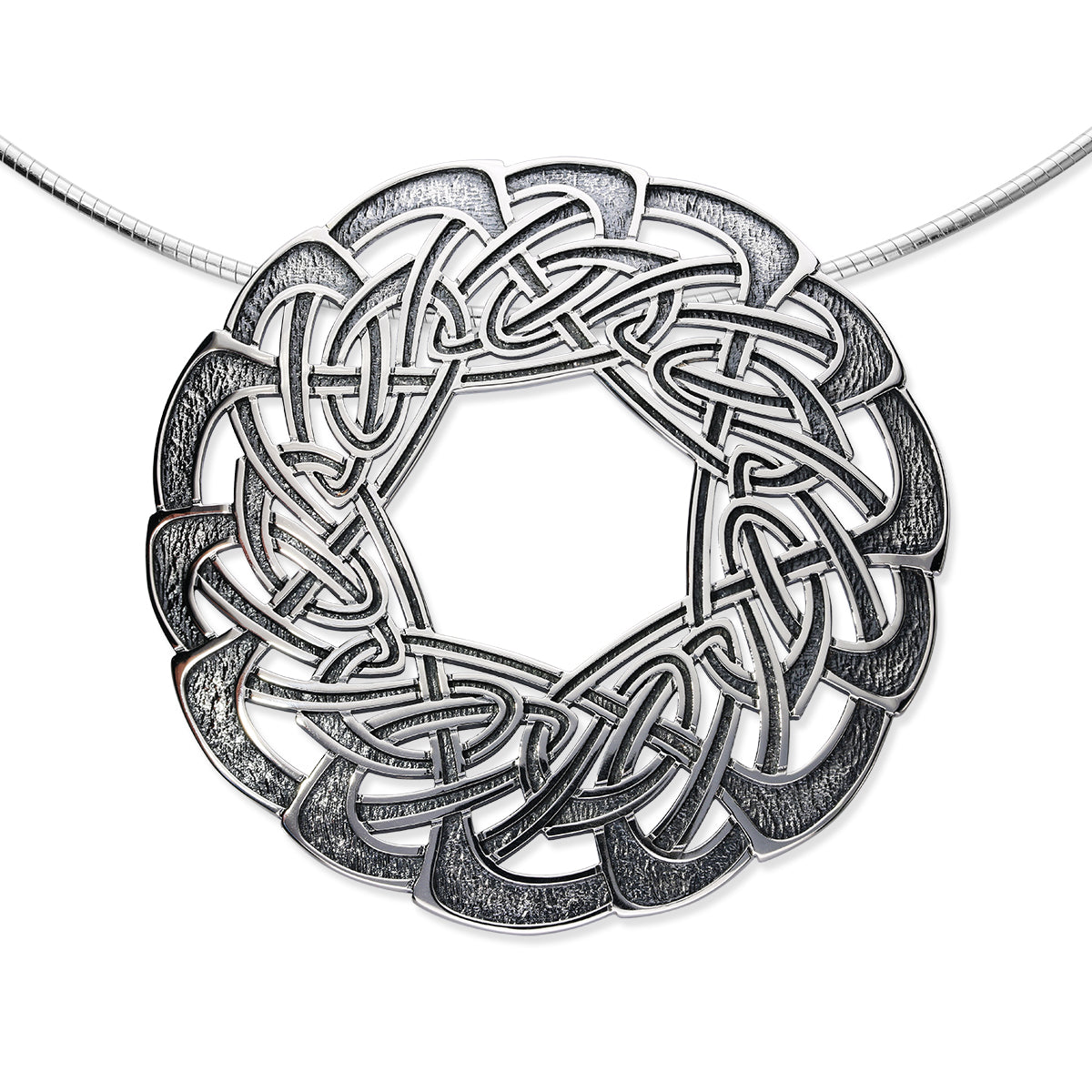This stunning Archibald Knox pendant in aquamarine enamel is a show-stopping piece on any person.  Approx. 61.5mm diameter and hangs elegantly on a sterling silver wire.  All hand crafted in sterling silver and complemented with hot glass enamel.  Comes in presentation box.