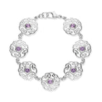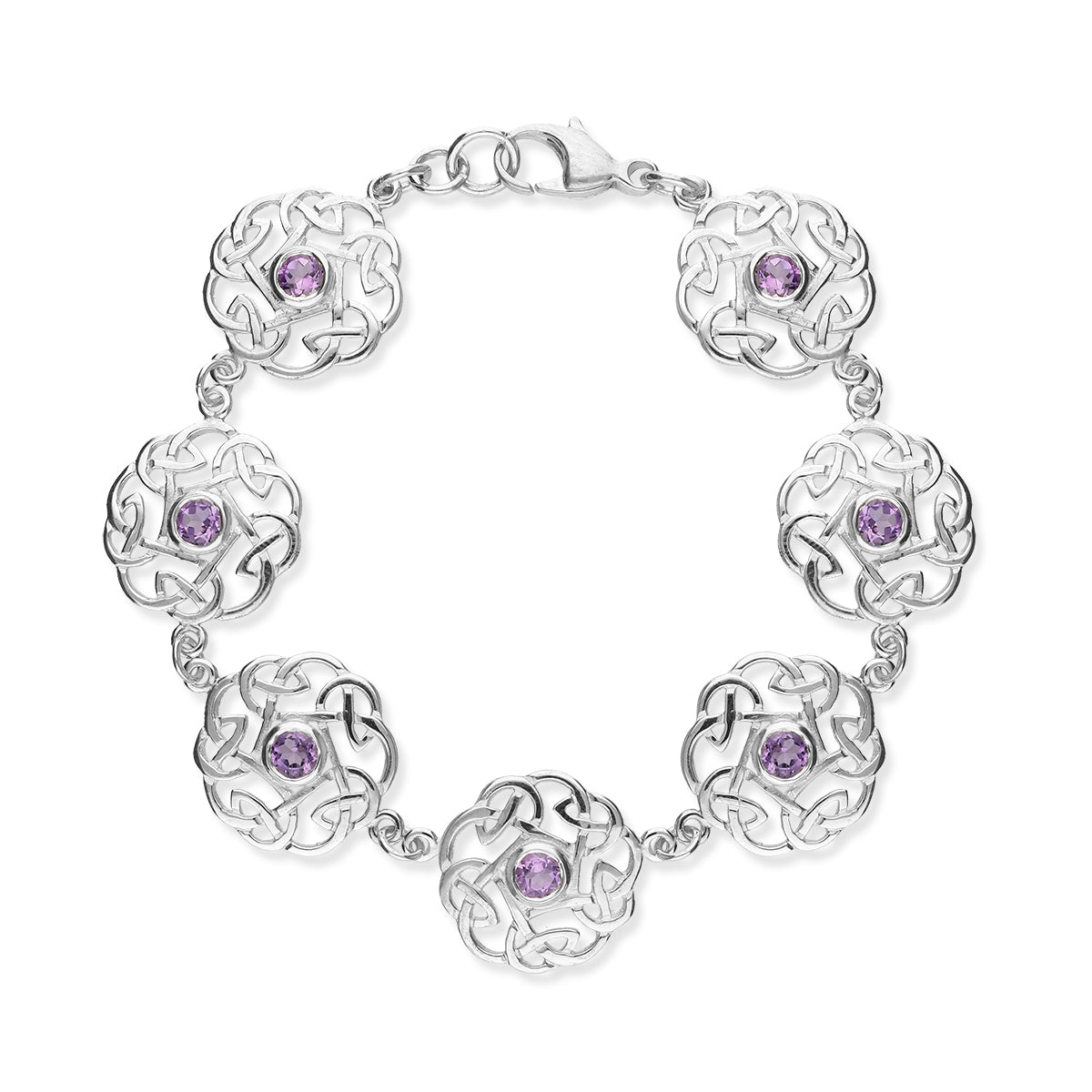 This full design bracelet features seven Celtic designs, crafted in Sterling Silver and hand set with Amethyst faceted stones.
