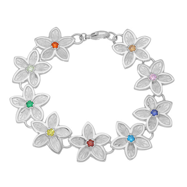 A sophisticated full bracelet consisting of 9 identical Sterling Silver links all featuring an elegant floral design each set with glitzy multi coloured Cubic Zirconia stones.