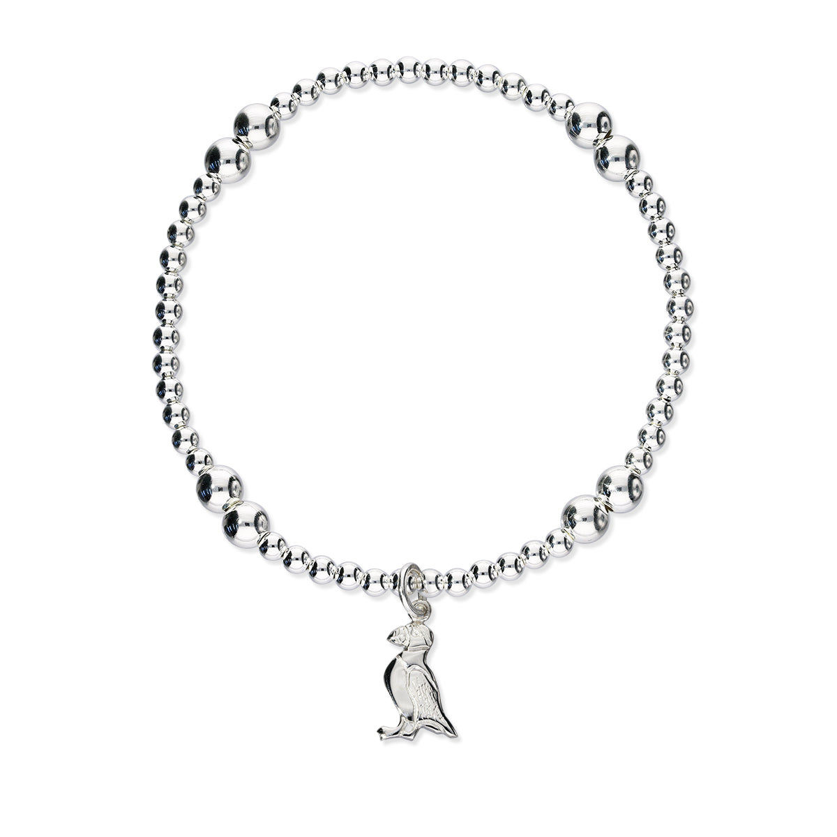 This Nature in Flight stretchy bracelet features a Puffin, or 'Tammie Norrie' as they are known in Orkney. Stylish and versatile, these silver stretchy bracelets are adorned with beautifully detailed Ortak charms. Comfortable to wear and easy to style, they’re perfect for layering or wearing alone for a simple, elegant statement.