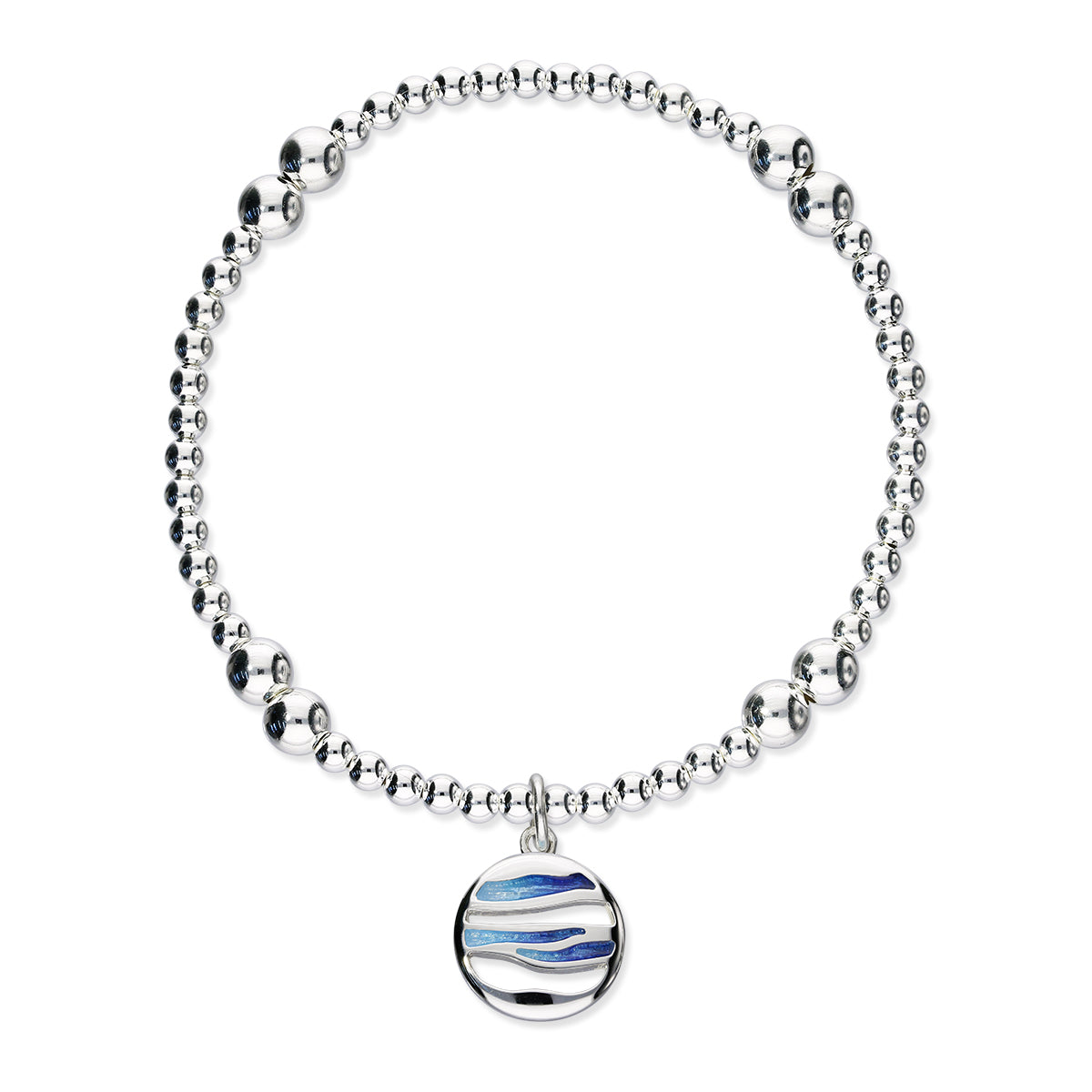 This Orbit stretchy bracelet features a sterling silver charm from our Orbit collection, enamelled in aquatic inspired colours.  Stylish and versatile, these silver stretchy bracelets are adorned with beautifully detailed Ortak charms. Comfortable to wear and easy to style, they’re perfect for layering or wearing alone for a simple, elegant statement.