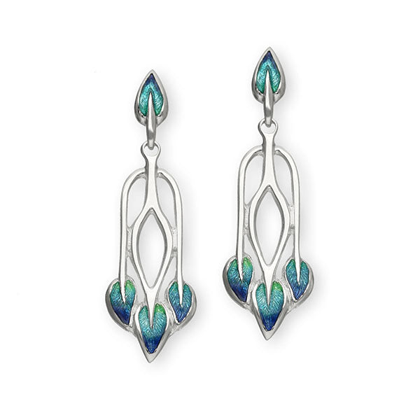Stunning long drop earrings inspired by the works of Charles Rennie Mackintosh, crafted in Sterling Silver and enhanced with hand enamelling in attractive colours.