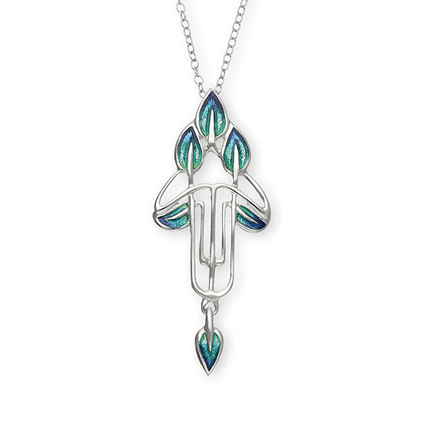A slender long drop pendant inspired by the works of Charles Rennie Mackintosh, available in Sterling Silver and hand enamelled in calming shades.