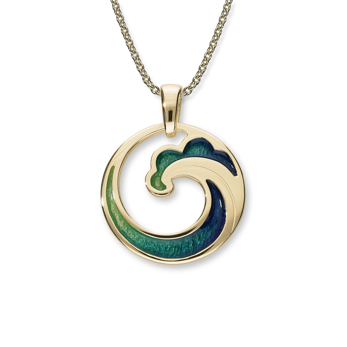 The aquatic colours used in this 'COASTAL' pendant capture the rolling waves familiar to our coastlines, created in 18ct Yellow Gold and hand enamelled.