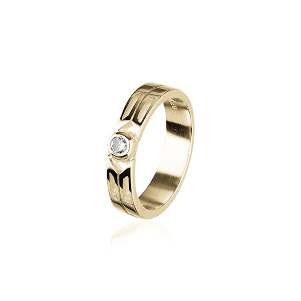 This striking ring is made in 9ct gold and set with a cubic zirconia in a bezel fitting.