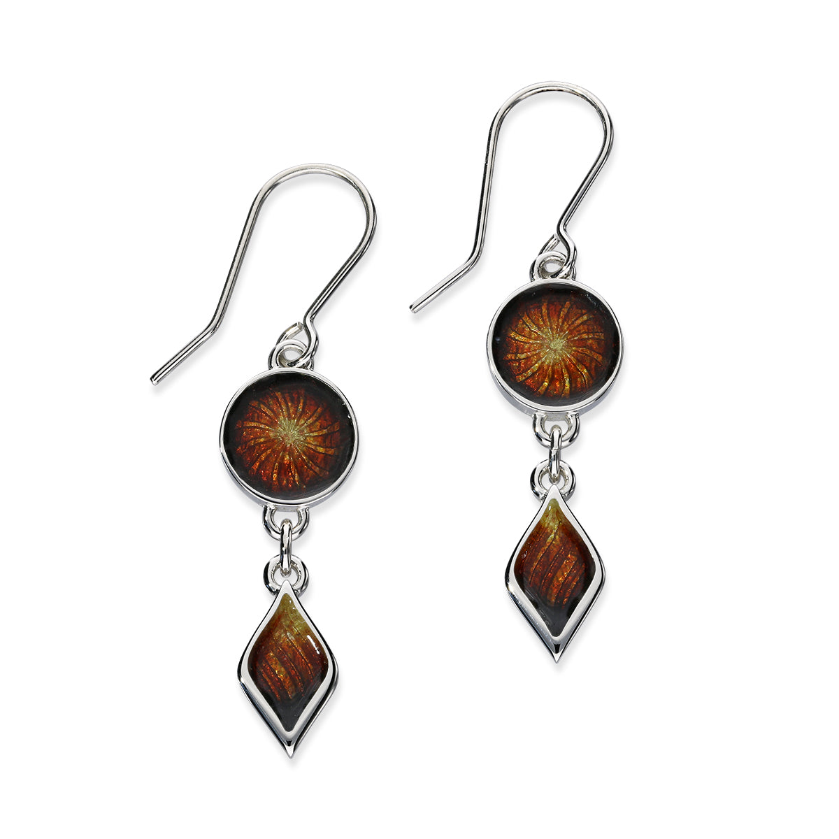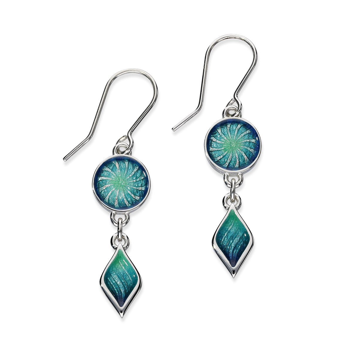 These long drop earrings comprise of two differing shapes both with patterned backgrounds which enhances the elegance of the hand enamelling.