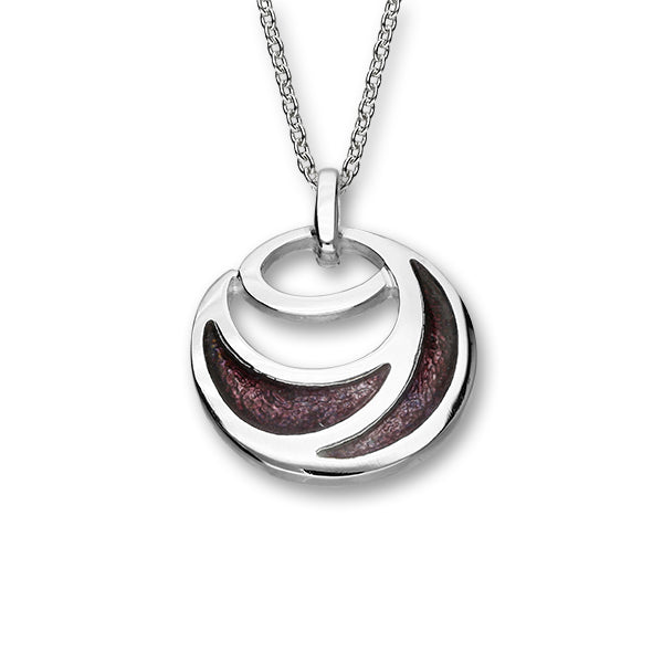 This delicate round shaped pendant with an intricate pattern is crafted in Sterling Silver and complemented with hand enamelling skills.