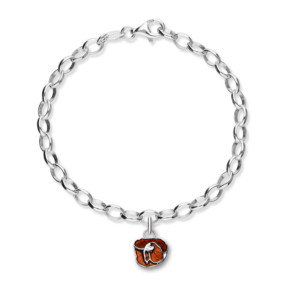 A Sterling silver charm bracelet with a Poppy charm dropper hand enamelled in elegant colours.