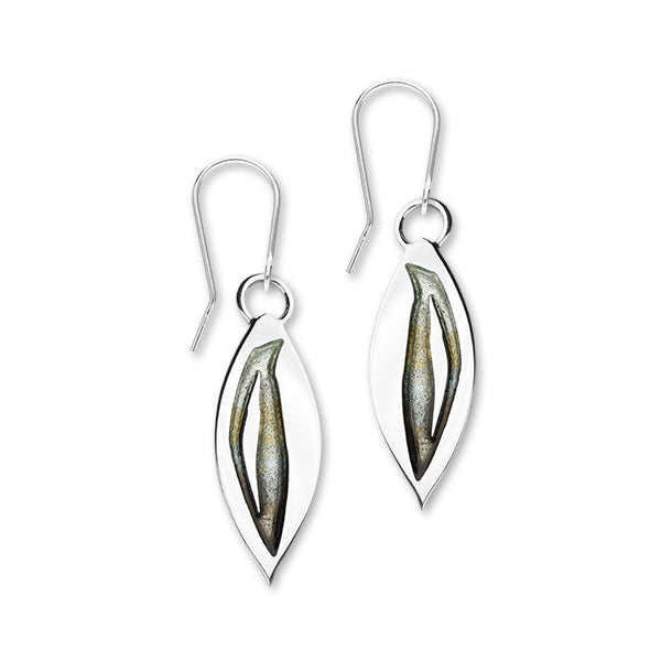 Attractive long drop earrings, available in Sterling silver and enhanced with hot glass enamel in the subtle shades of Charcoal.