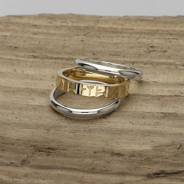 Love, loyalty, friendship inscribed in ancient runes wind around these simple polished bands.
