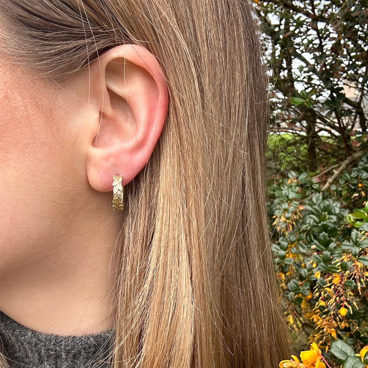 The Spring Leaves hoop earrings bring a fresh, nature-inspired twist to a classic hoop design. Featuring a delicate leaf texture that wraps subtly around the hoop, these earrings capture the essence of new growth and Spring. Their small, hoop style makes them a perfect everyday accessory.