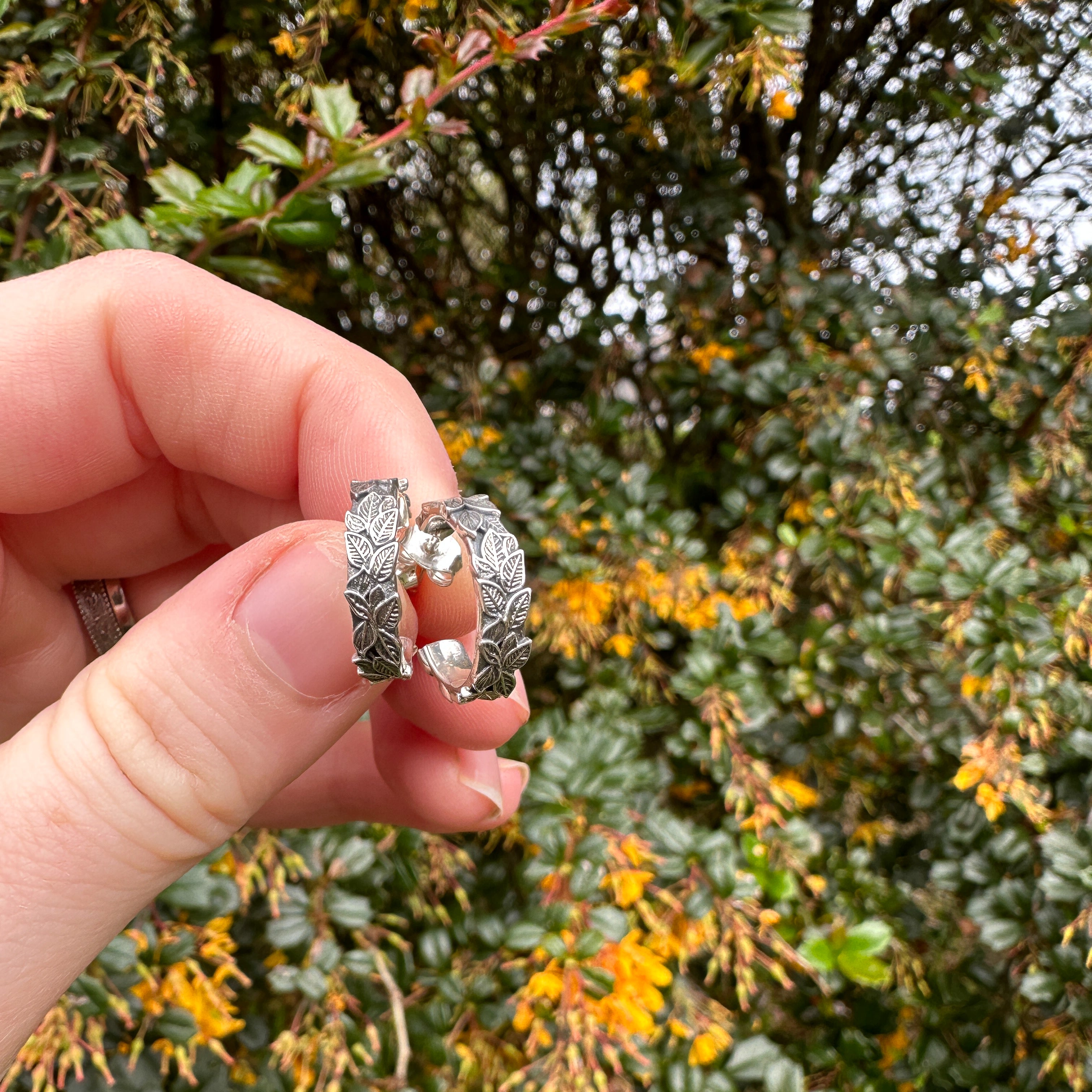 The Spring Leaves hoop earrings bring a fresh, nature-inspired twist to a classic hoop design. Featuring a delicate leaf texture that wraps subtly around the hoop, these earrings capture the essence of new growth and Spring. Their small, hoop style makes them a perfect everyday accessory.