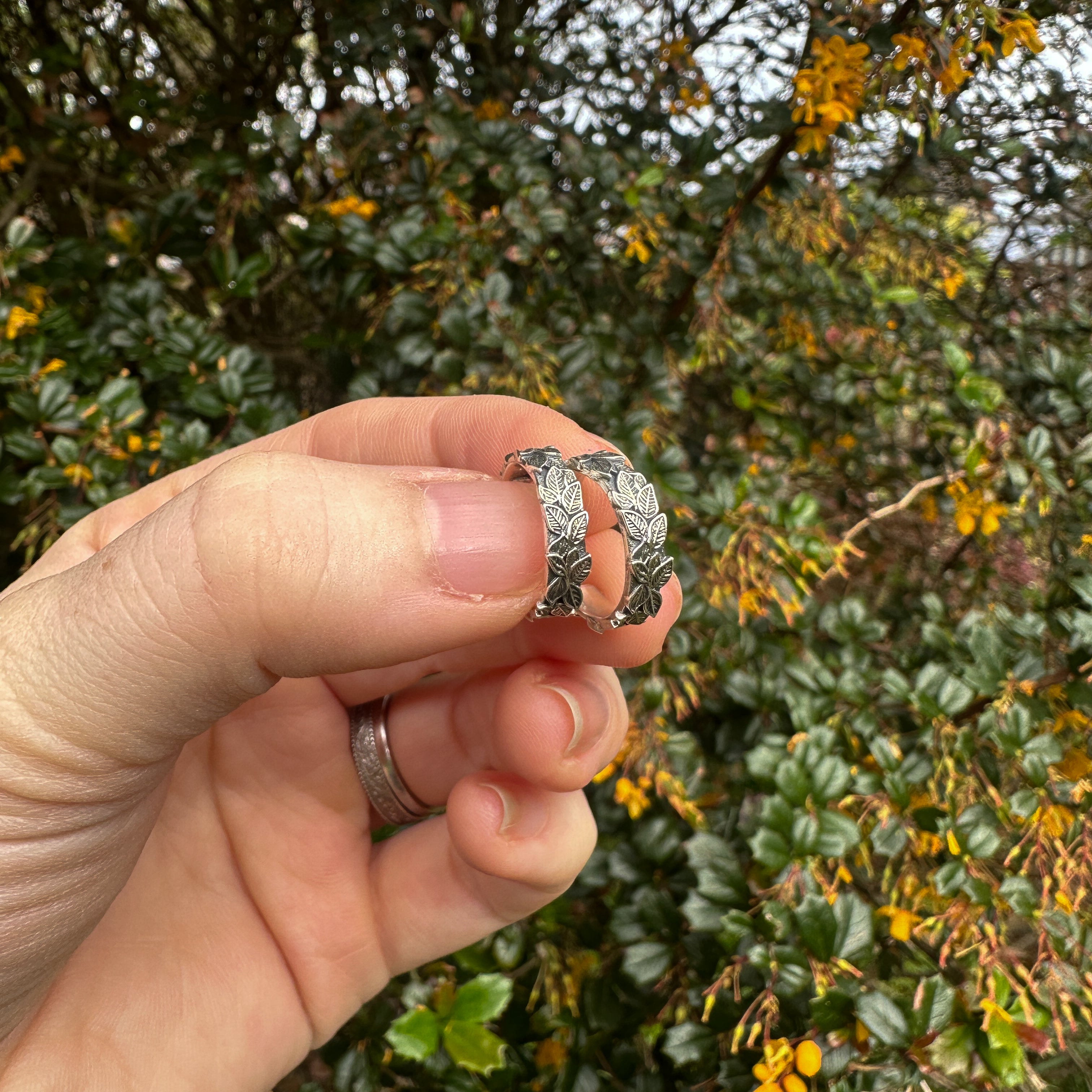 The Spring Leaves hoop earrings bring a fresh, nature-inspired twist to a classic hoop design. Featuring a delicate leaf texture that wraps subtly around the hoop, these earrings capture the essence of new growth and Spring. Their small, hoop style makes them a perfect everyday accessory. Our oxidised version has a darkened, textured finish that brings out the intricate veins and curves of the leaf, adding a touch of rustic charm and vintage appeal.