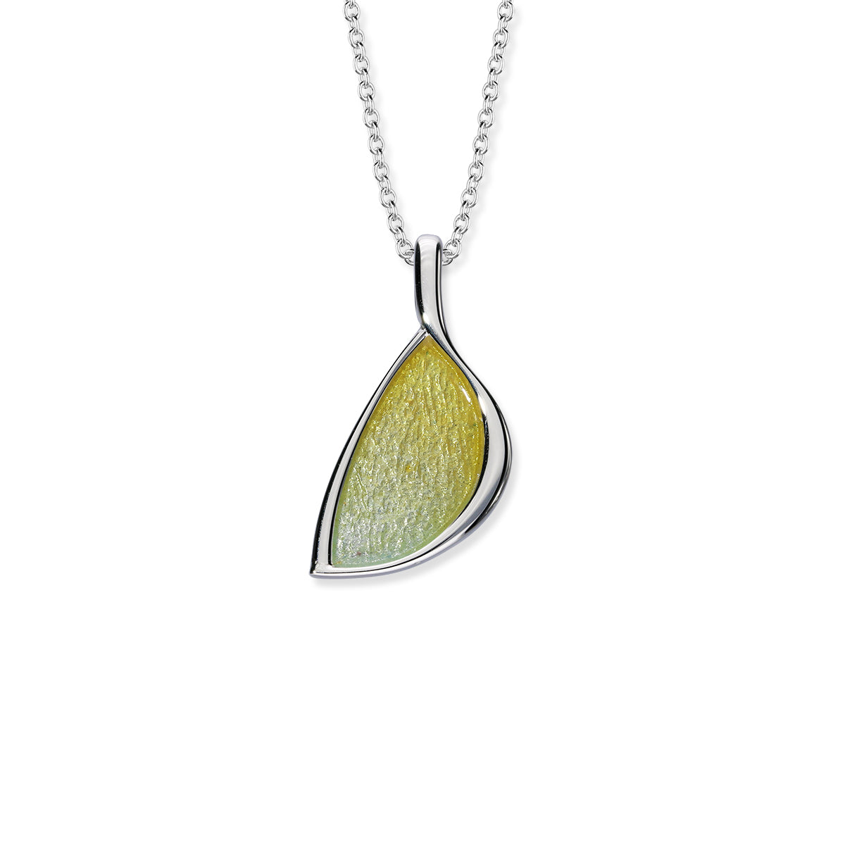 A striking hand enamelled pendant available in Sterling silver and complemented with subtle colourings of hot glass enamel.