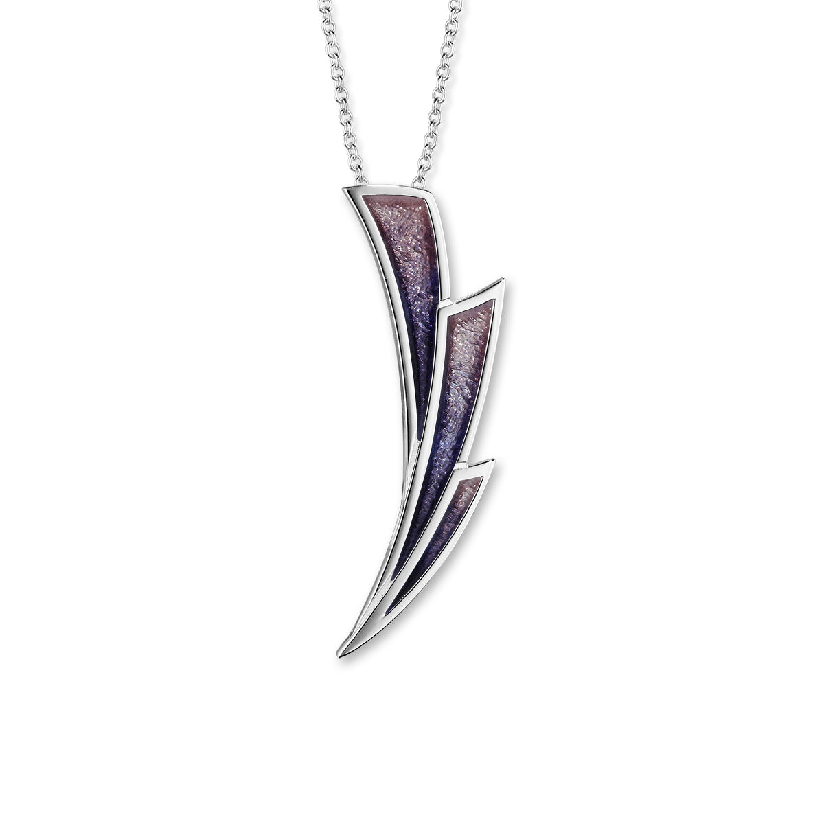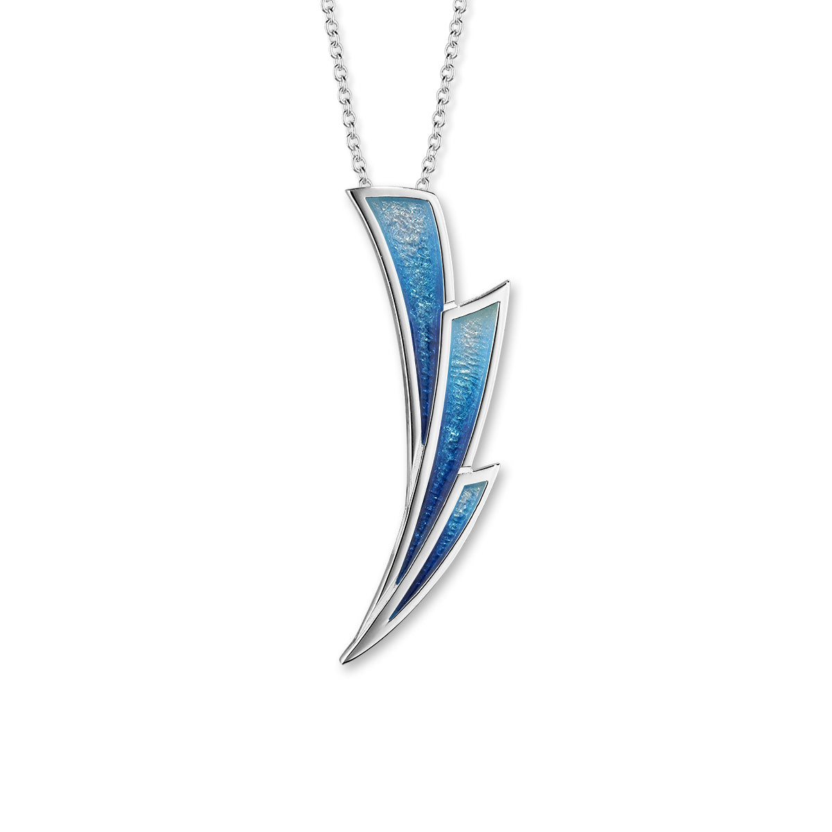 A striking sterling silver pendant, enhanced with hot glass enamel, shown here in Waterfall and Ignite.