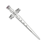 Decorative design sterling silver Kilt Pin with a cut stone amethyst set in the top of the design.