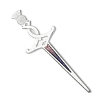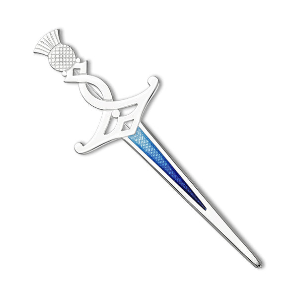 This beautiful kilt pin takes the traditional symbol of Scotland and transforms it into a unique and stylized design, crafted in sterling silver and complemented with hand enamelling, available in Oasis, Haze or Sirocco colourways.