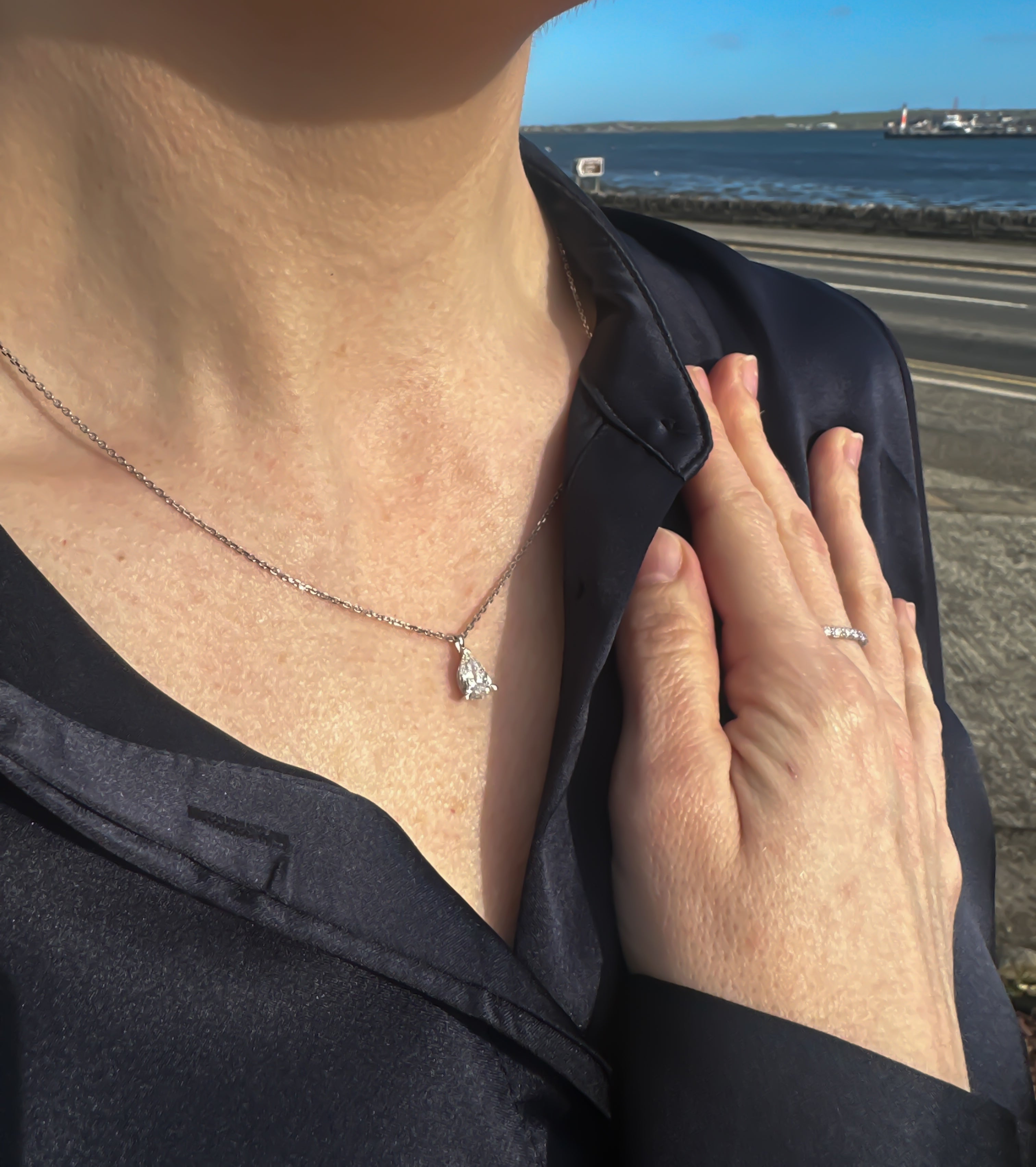 This 18kt white gold single stone pear shaped lab grown diamond pendant is an elegant and sustainable option for those seeking a brilliant round diamond. Set in 18kt white gold, this 1.04ct diamond shines effortlessly on a 16-18" chain, making it the perfect addition to any outfit.