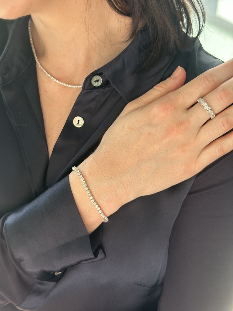 White Gold Tennis Style Necklet with Round Shaped Lab Grown Diamonds UDN1001 is a stunning piece of jewellery that adds a touch of luxury to any outfit. The 46cm necklet is embellished with 5.02ct of sparkling lab grown diamonds, all set in 18kt white gold. Enjoy the benefits of beautifully crafted jewellery without the environmental impact or ethical concerns of mined diamonds.