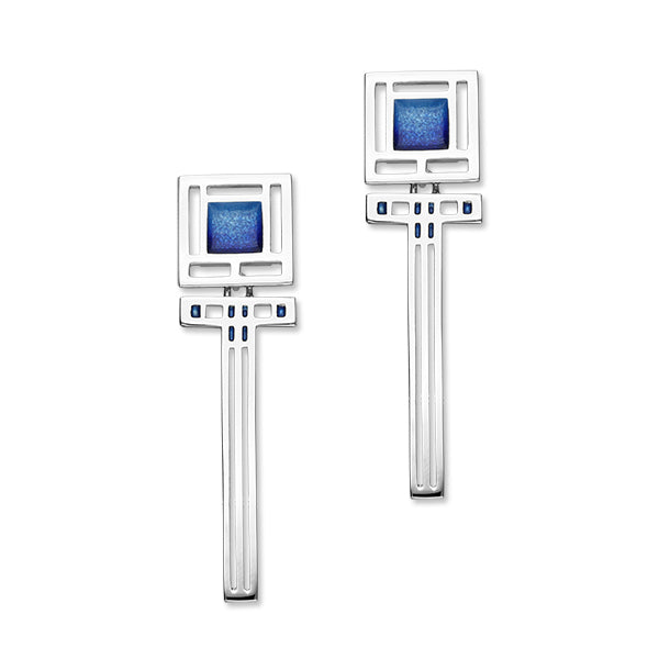 These long drop earrings are available in sterling silver and enhanced with hot glass enamel. The design is inspired by the works of American architect Frank Lloyd Wright - the design source is the Playroom Art Glass Window inside the Frank Lloyd Wright Home and Studio in Illinois.