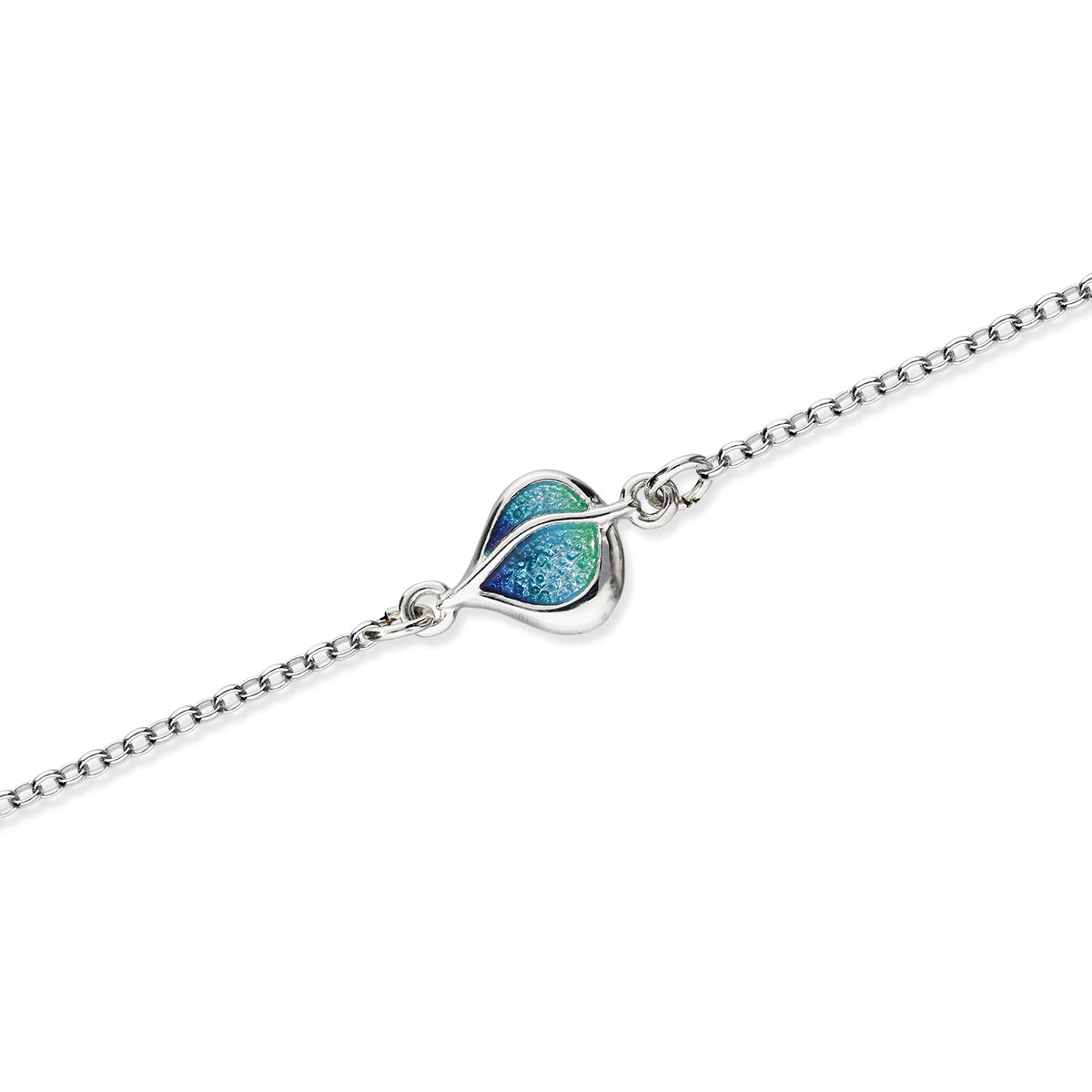 Handcrafted with sterling silver, this Leah bracelet features a delicate leaf design adorned with vibrant shades of green and blue glass enamel. Elevate any outfit with this unique and elegant accessory.