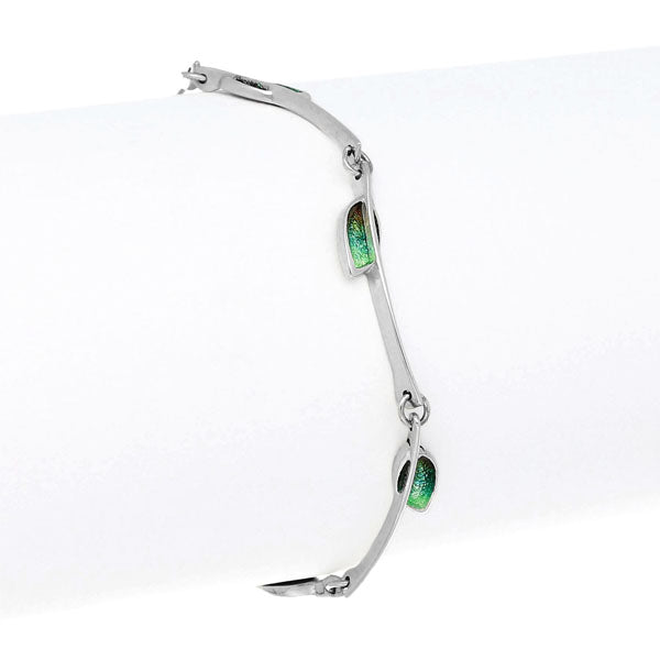 This delicate bracelet is available in Sterling Silver and sees 5 identical links all complemented with attractive colourings of hot glass enamel.