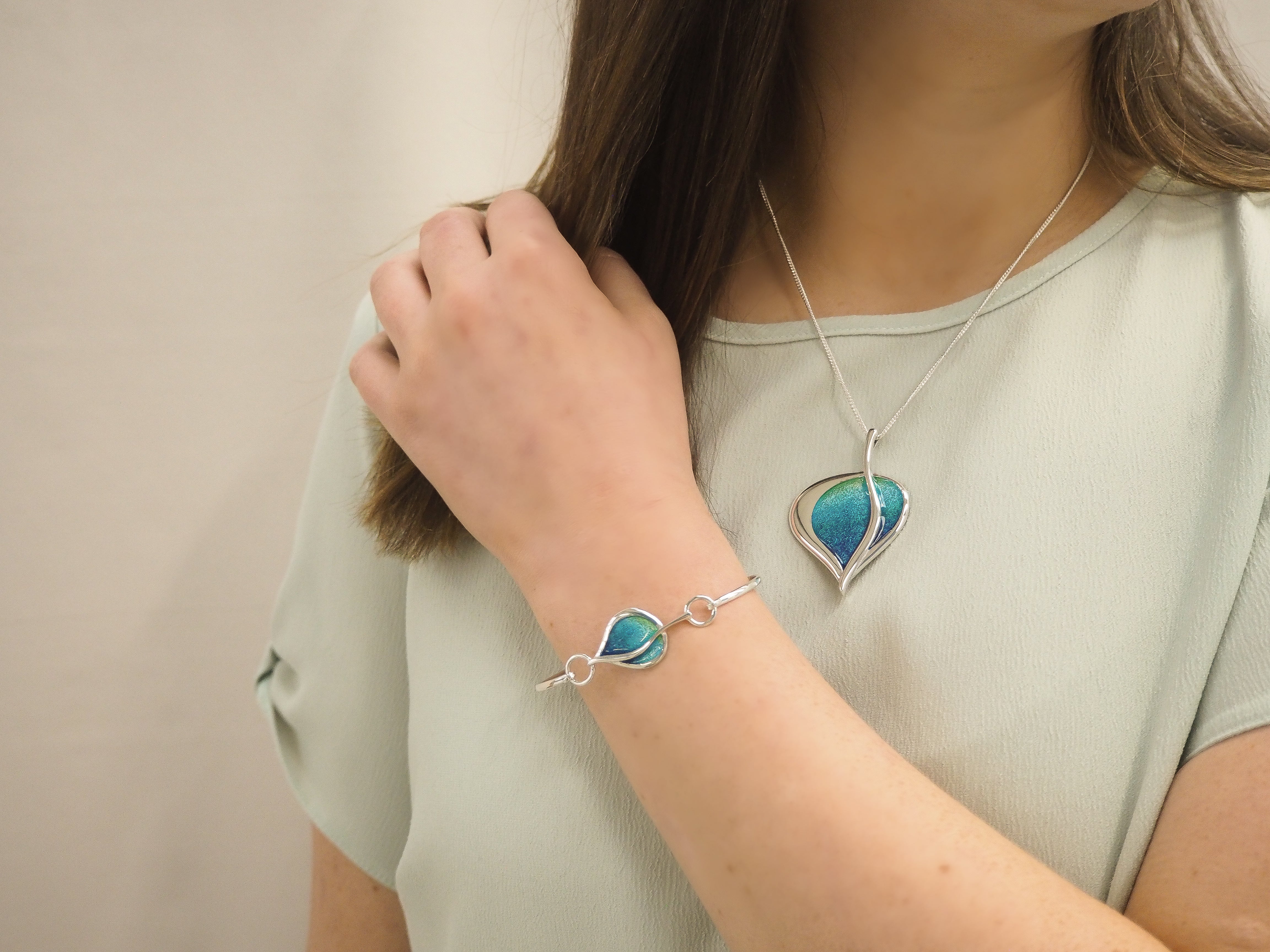 Spring leaves are beautifully encapsulated in this pendant made from Silver and Aquamarine Enamel.
