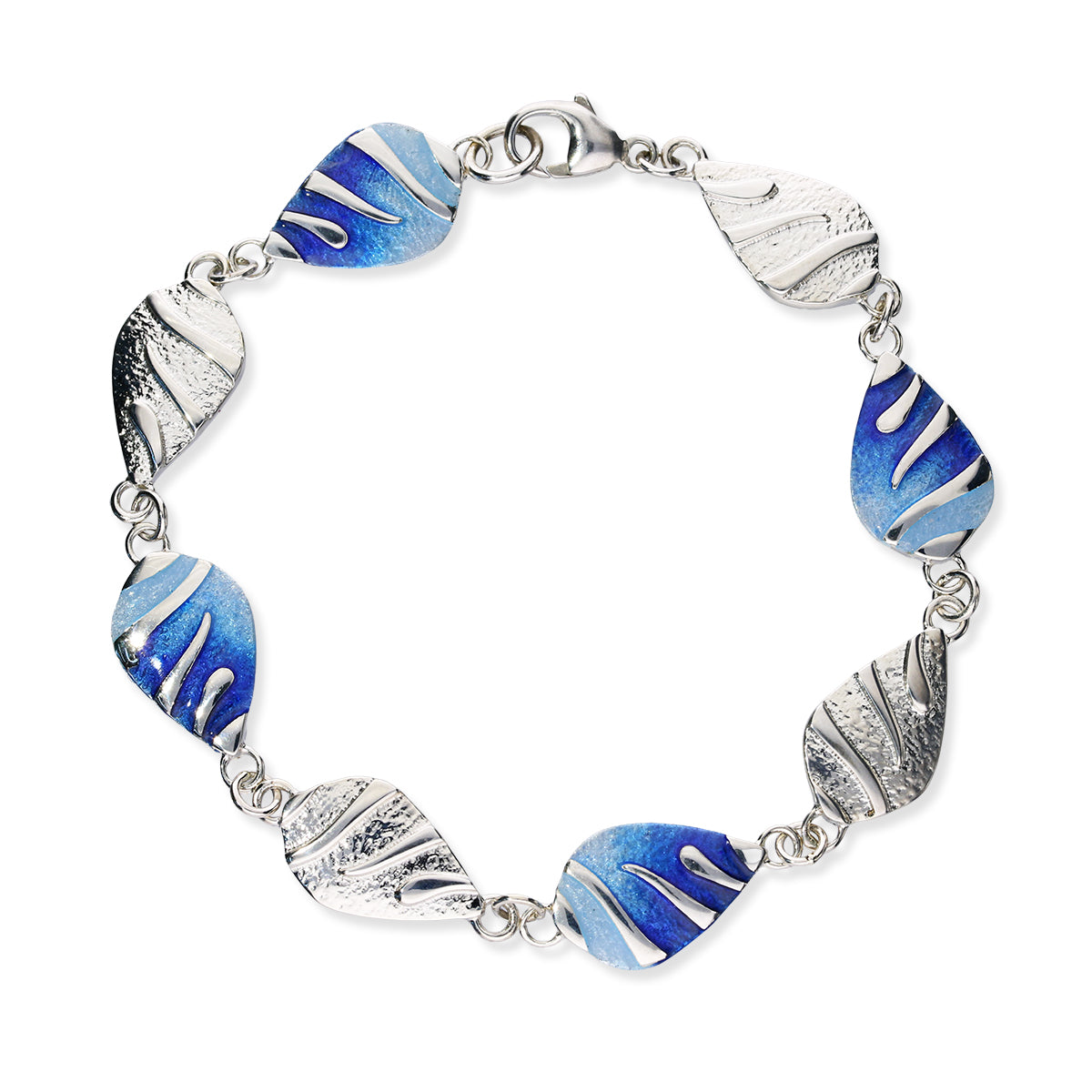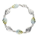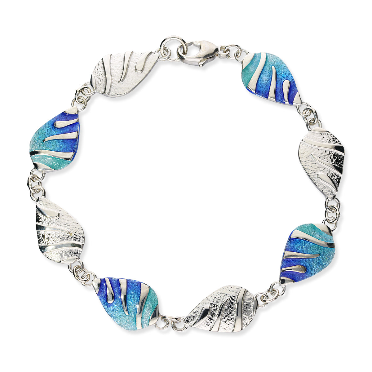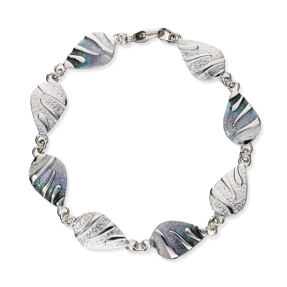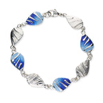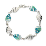 This full bracelet of eight identical links all created in silver and half of them left natural and the rest hand enamelled using the vibrant shades of Rainbow, Waterfall or Mangrove.