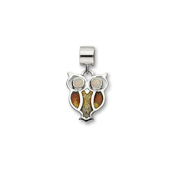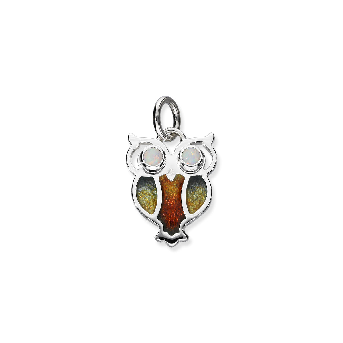A cheeky little Owl charm crafted in Sterling Silver, hand enamelled in vibrant shades and complemented with white fiery opals in the eyes. This charm fits any Universal charm bracelet and can be sold individually or with a heavy Sterling Silver snake chain bracelet