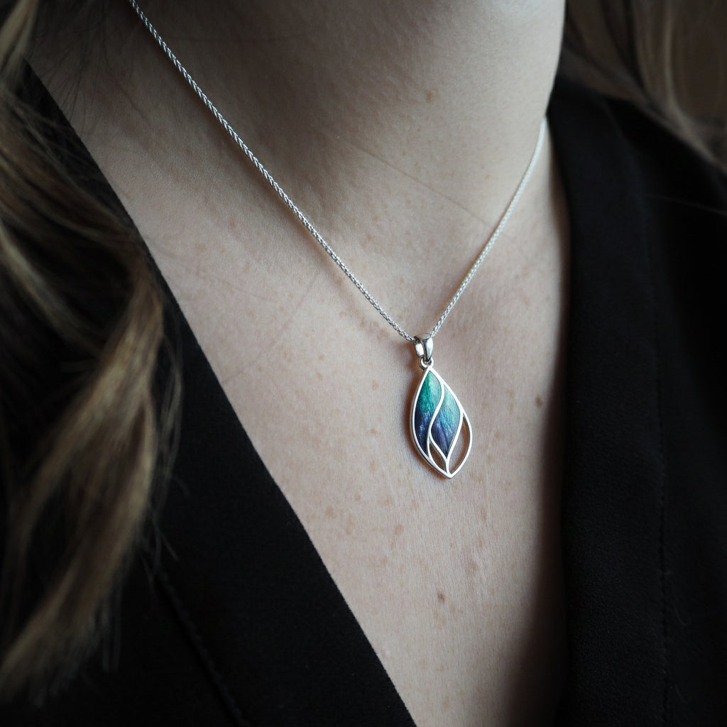 This statement sterling silver pendant features a hand-enamelled centrepiece in soft green and purple shades inspired by the Northern Lights. The smooth silver frame gently surrounds the marquise-shaped enamel, letting the colours stand out and catch the light.