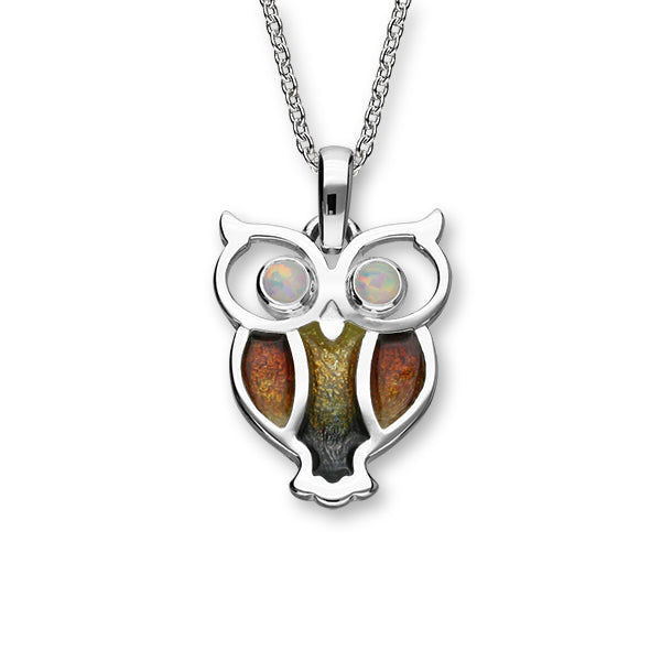 This cheeky little Owl pendant is crafted in Sterling Silver, hand enamelled in vibrant shades and complemented with white fiery opals in the eyes.