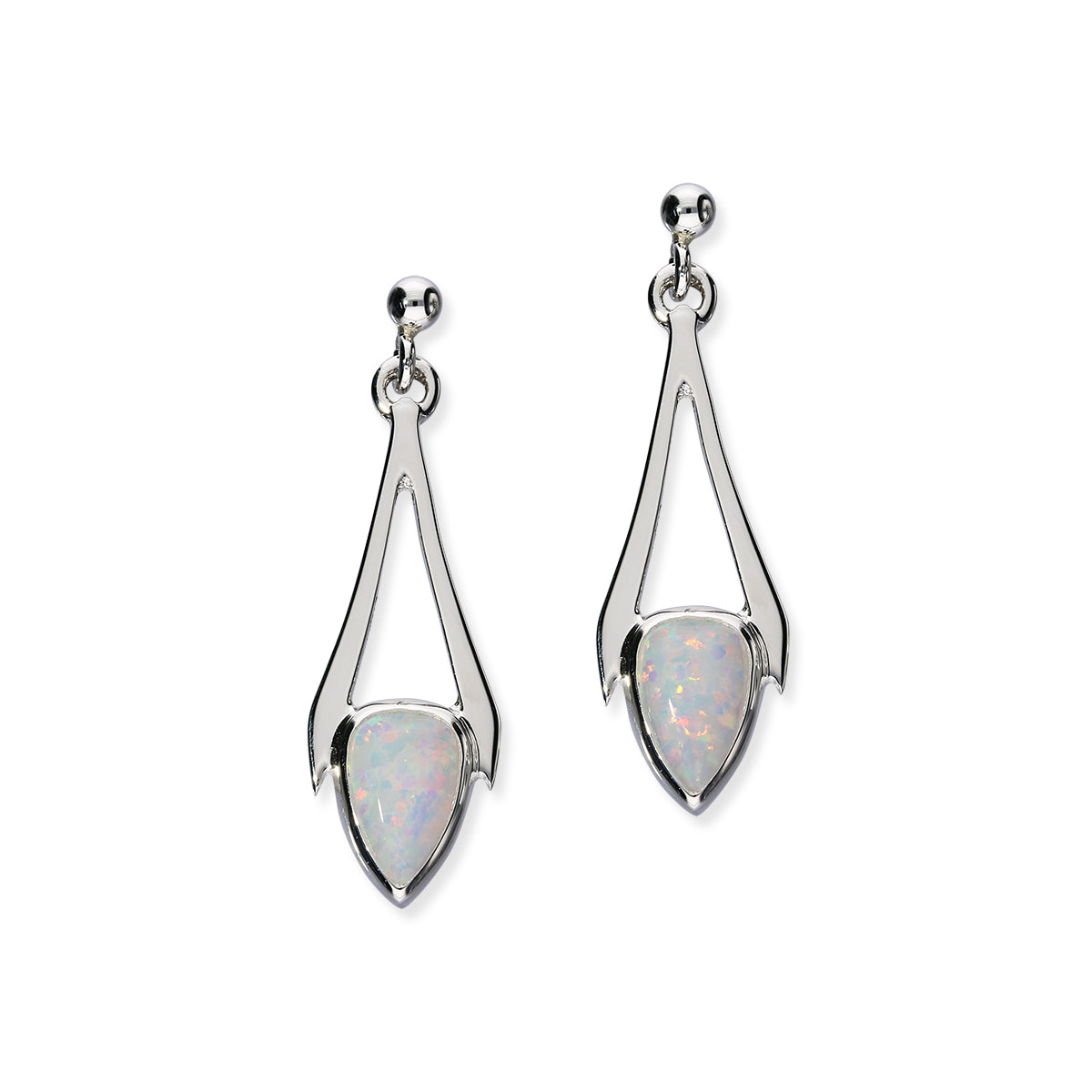 These angelic drop earrings are available in Sterling silver and have elegant shaped created White Opal stones as the focal point of the design.