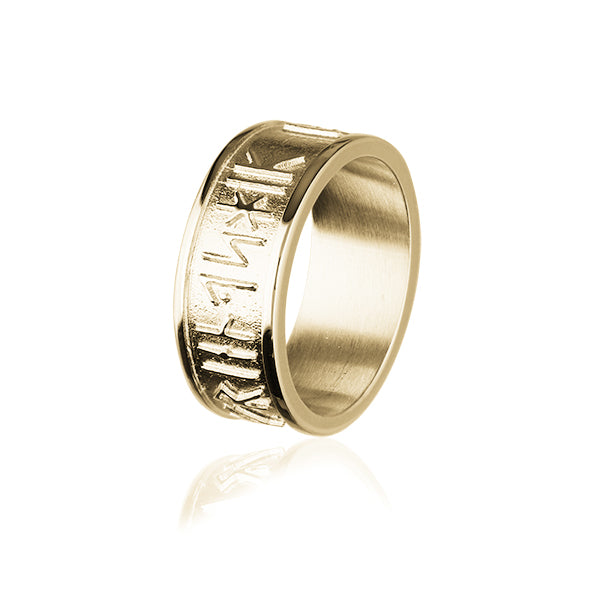 Love, loyalty, friendship inscribed in ancient runes wind around these simple polished bands.