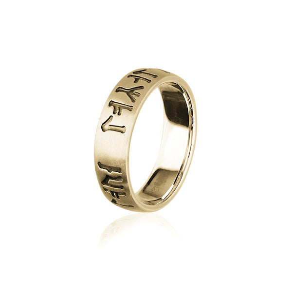Love, loyalty, friendship inscribed in ancient runes wind around these simple polished bands.