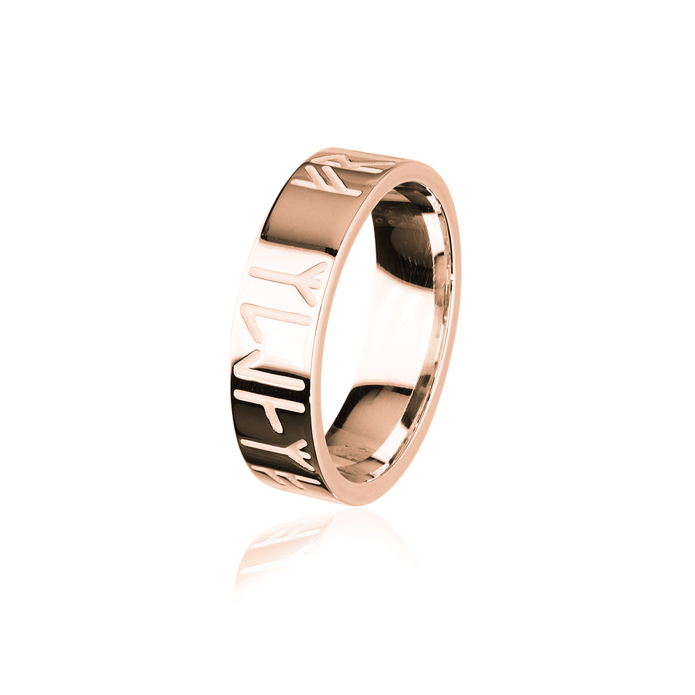 Love, loyalty, friendship inscribed in ancient runes wind around these simple polished bands.