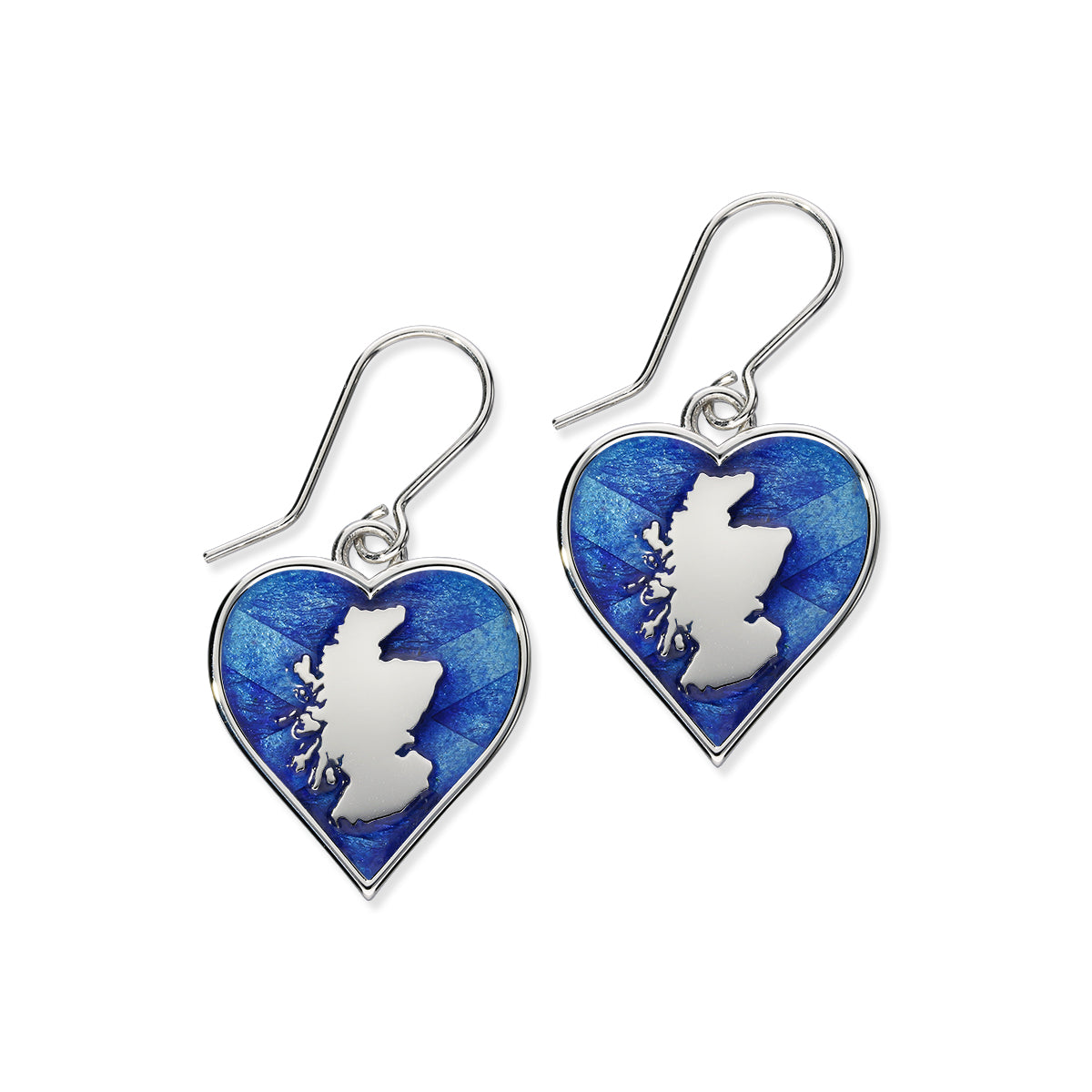 These Scottish heart earrings are perfect for showing off your Scottish pride. The drop earrings feature a map of Scotland in the shape of a heart enhanced by glass enamel in the blues of the saltire, making it a unique and meaningful accessory. Add it to your collection today and share your love of Scotland with the world.