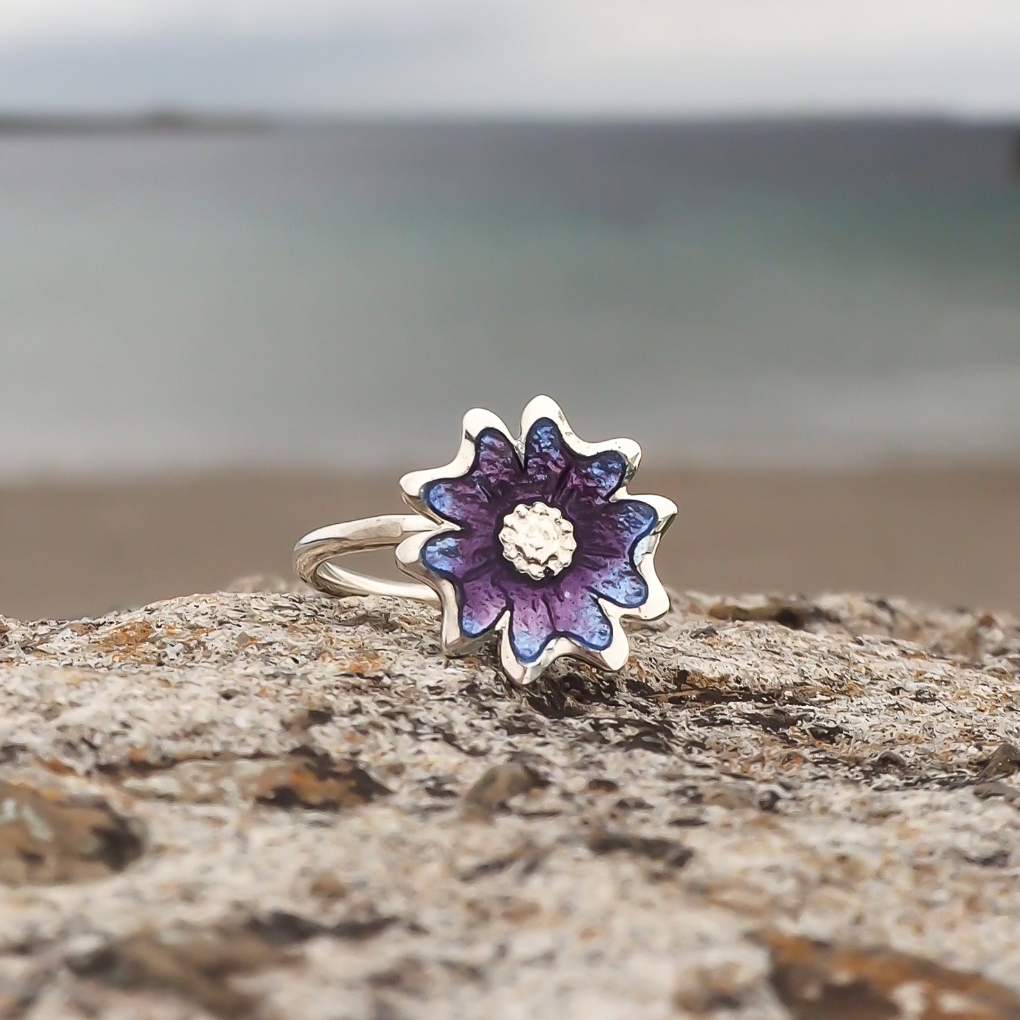 Medium Scottish Primrose ring crafted in sterling silver and enhanced with hot glass enamel in the attractive colours of Midnight Amethyst