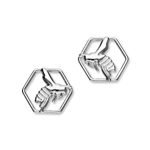 Attractive stud earrings crafted in sterling silver, a single honeycomb shape with the Honey Bee design.