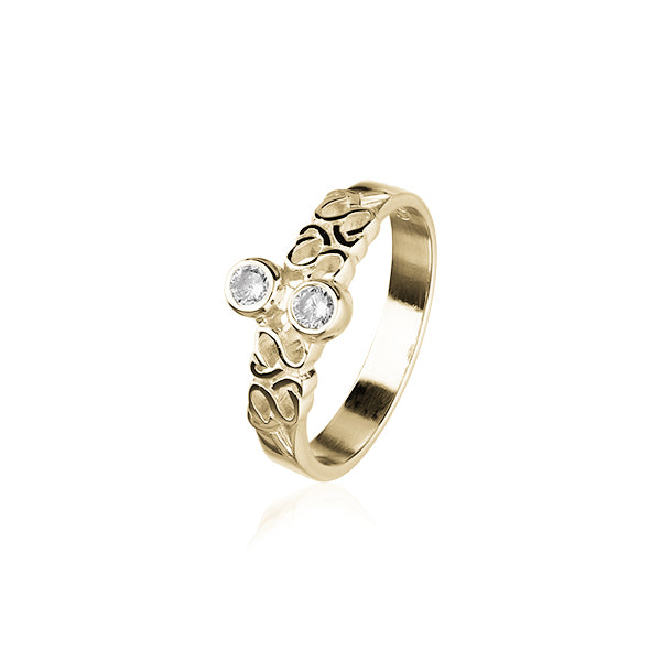 An intricate ring, crafted in 9ct gold set with two Cubic Zirconias in bezel fittings along with flowing lines come together to create a modern design.