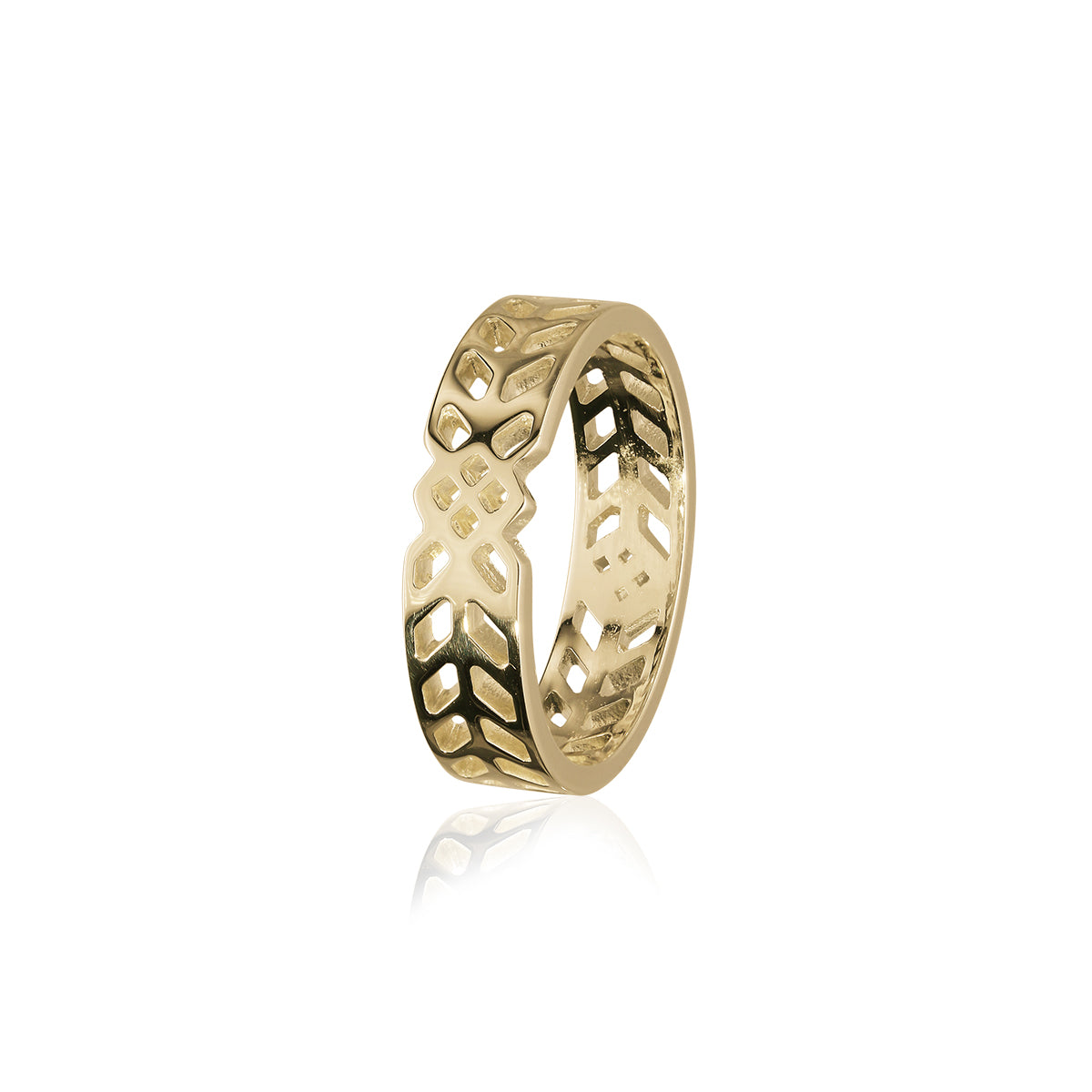This intricate ring is crafted in 9ct gold. The design is inspired by the works of American architect Frank Lloyd Wright - the design source can be found on an Art Deco glass sideboard found within Warren McArthur House in Illinois