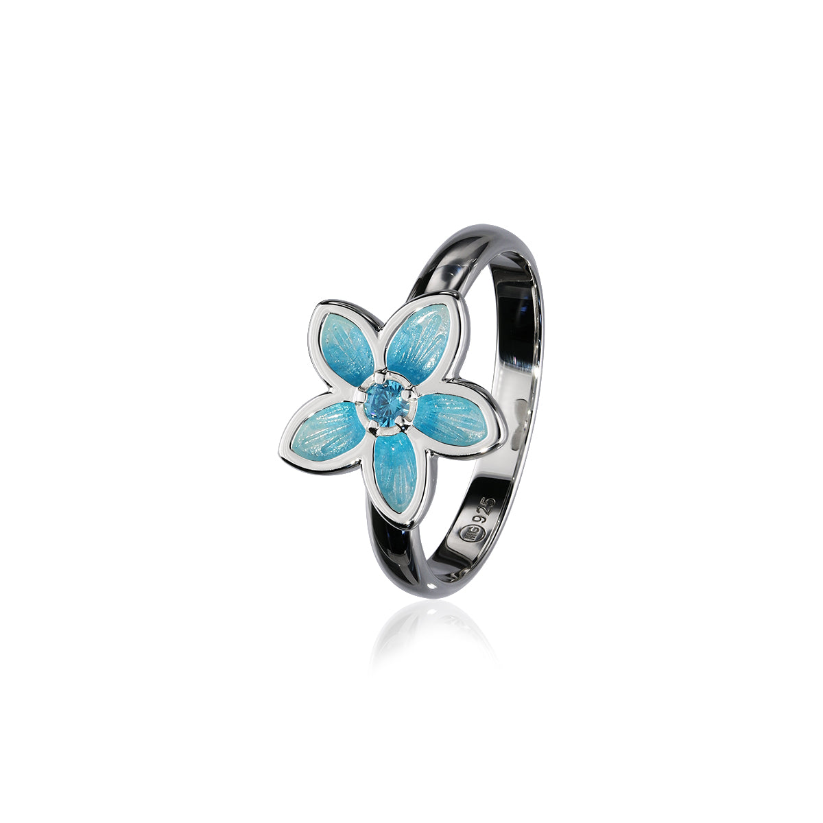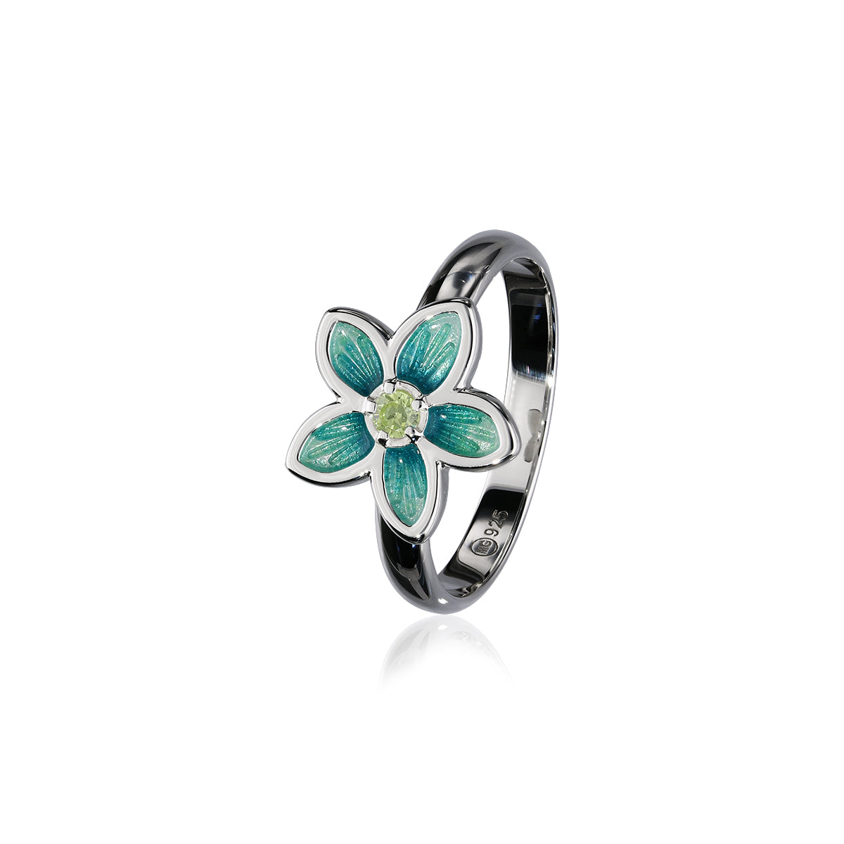 A dainty Sterling Silver ring featuring a floral design, hand enamelled and set with a Yellow Cubic Zirconia stone to add some sparkle.
