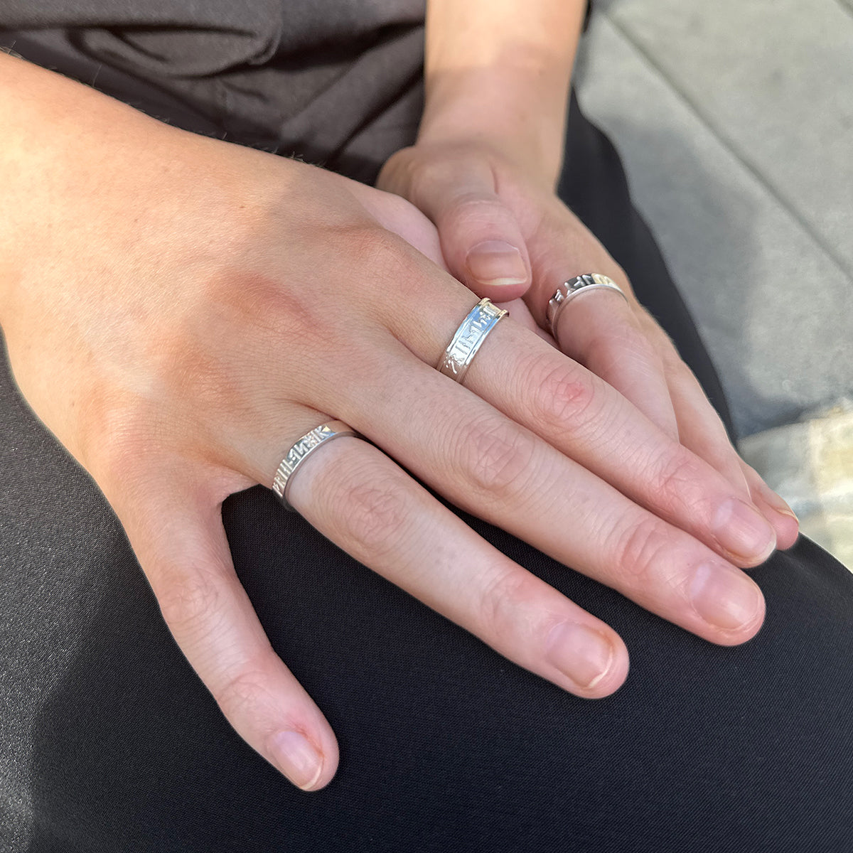 Love, loyalty, friendship inscribed in ancient runes wind around these simple polished bands.