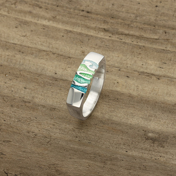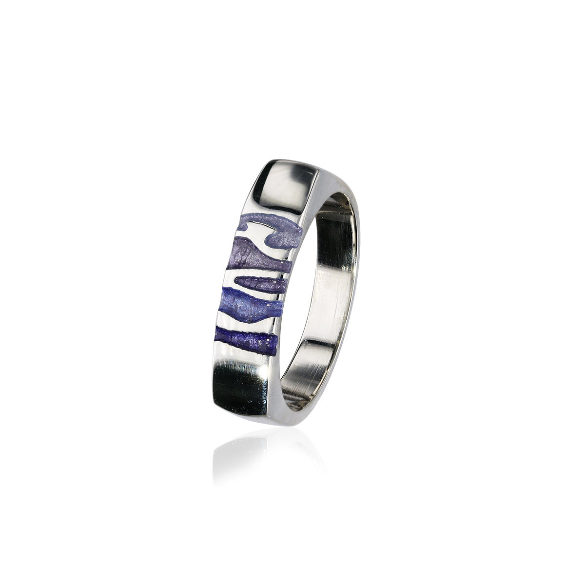 A stylish Sterling Silver ring enhanced with hot glass enamel.