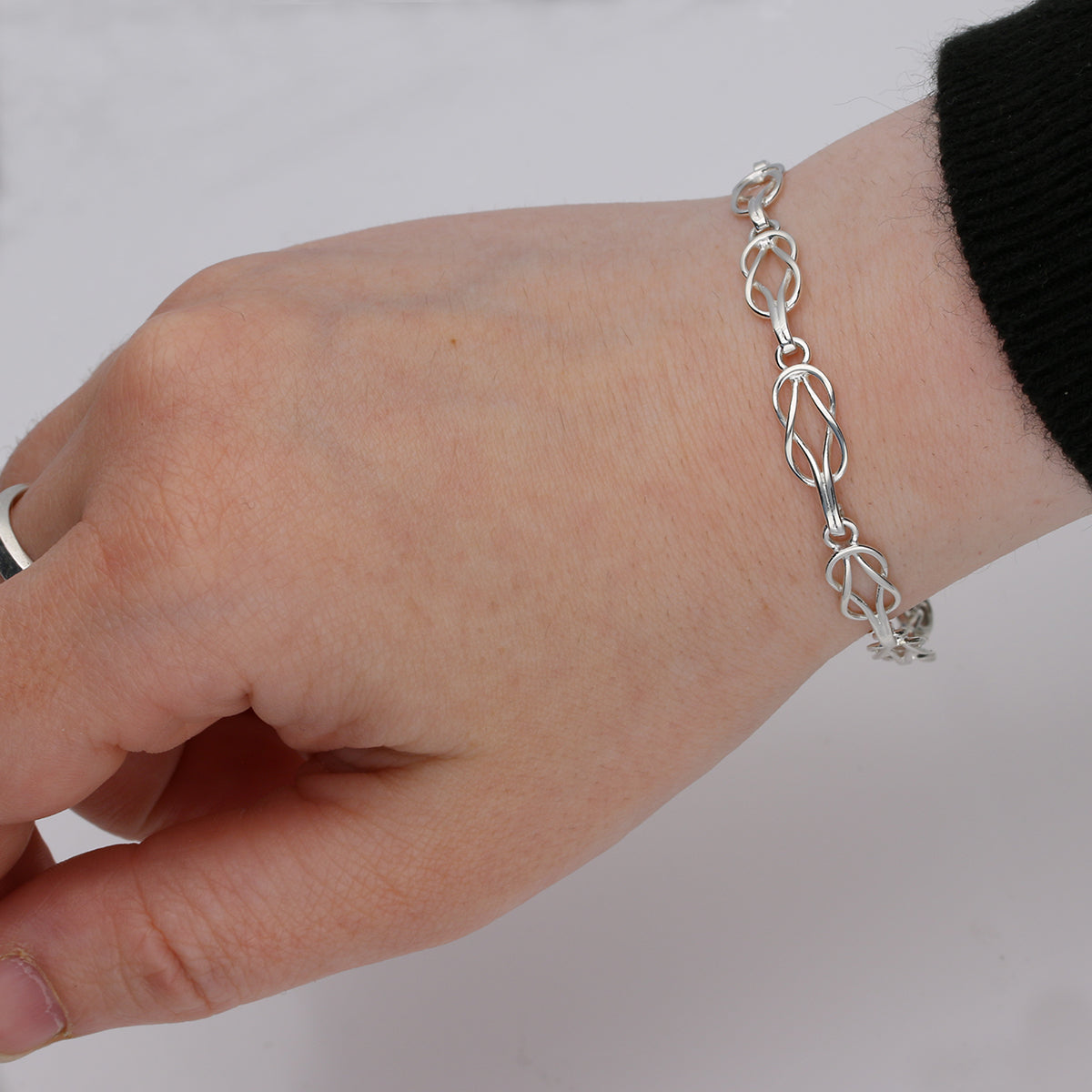 An intricate sterling silver bracelet made up of 9 links to create intertwined silver links.