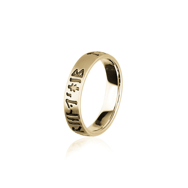 Love, loyalty, friendship inscribed in ancient runes wind around these simple polished bands.