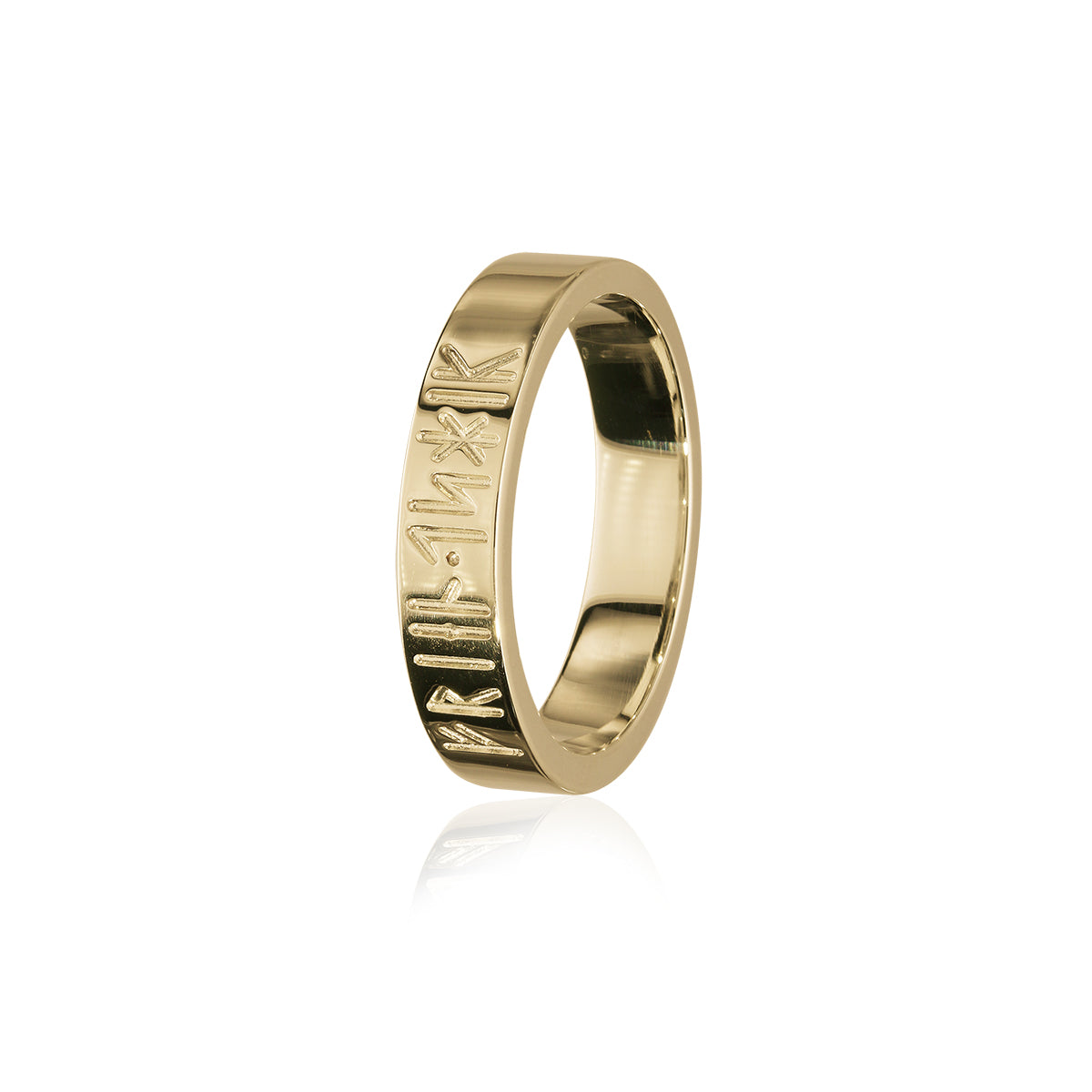 Love, loyalty, friendship inscribed in ancient runes wind around these simple polished bands.